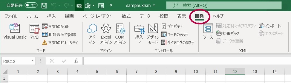 Excel を開いたとき、「開発」タブは表示されていますか?下記のようなメニューです。