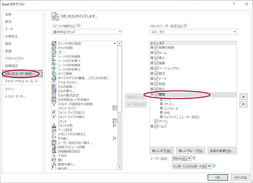 左側のペインにある「リボンのユーザー設定」をクリックし、右側のペインの「メインタブ」の設定リストにある「開発」にチェックを入れます。
