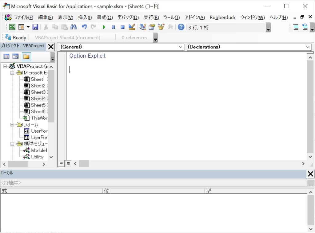 前述のとおり、Microsoft Excel を用いて学習を進めます。VBA を触ったことがない方もいらっしゃると思いますので、VBA Editor を簡単に説明しておきたいと思います。